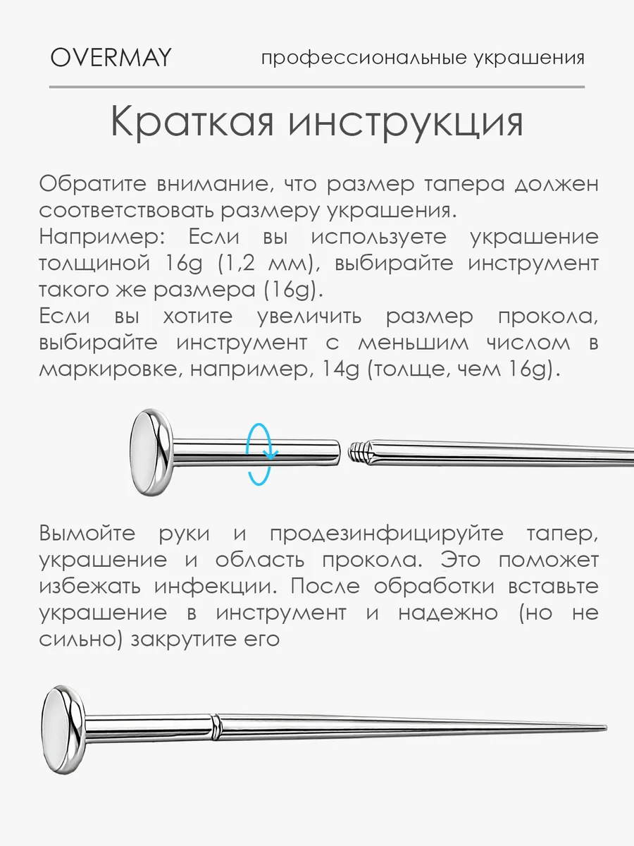 Тапер для пирсинга от бренда Overmay представляет собой идеальный выбор для тех, кто ищет качественное и безопасное решение для пирсинга своего тела.