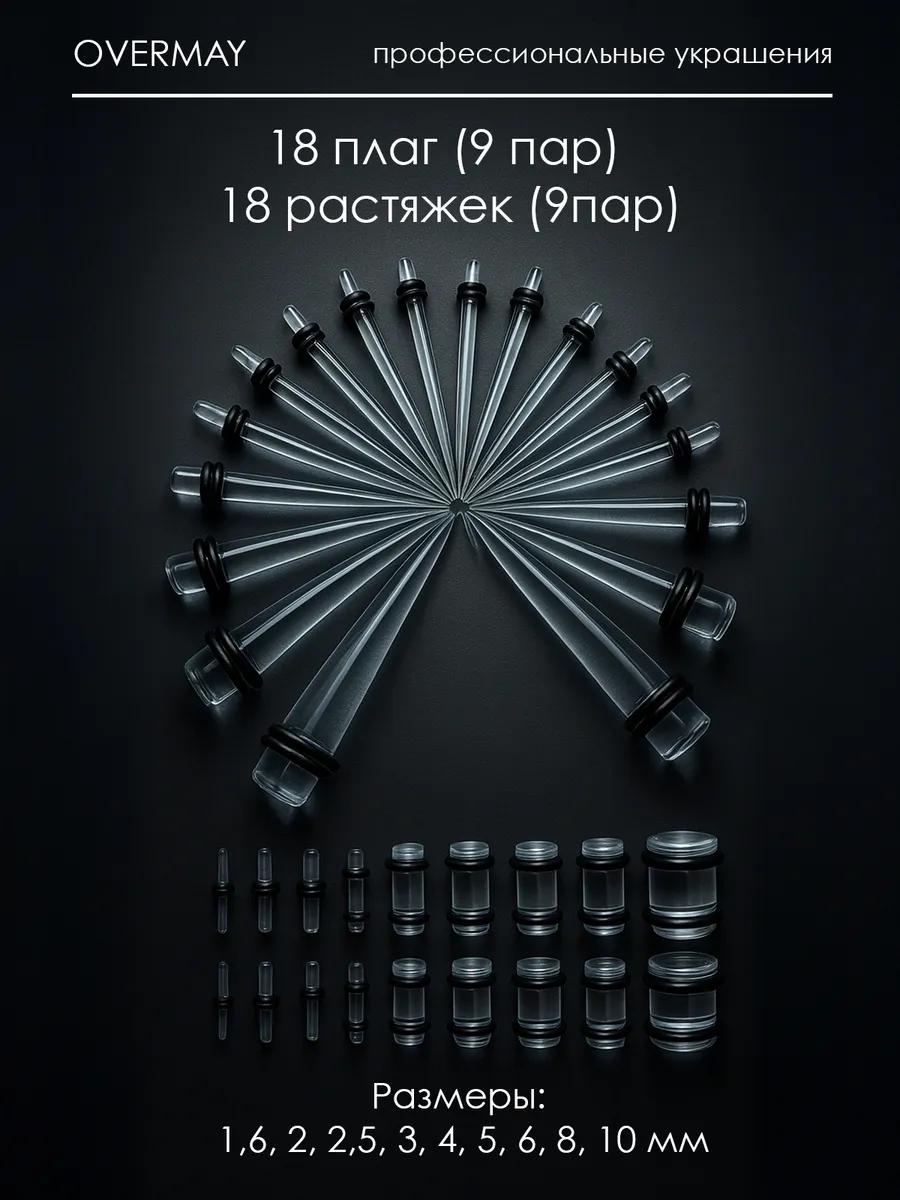 Растяжки для ушей под плаг или тоннель. Растяжки для тоннелей можно также использовать как самостоятельное украшение, они добавляют изюминку в имидж и позволяют модифицировать свою внешность. Растягивать мочки ушей под тоннели следует бережно и постепенно, начиная с растяжки самого маленького диаметра. Растяжка тоннелей изг.отовлена из качественного гипоаллергенного биопластика. Комплект растяжек для тоннелей 36шт: 18 плаг + 18 расширителей.