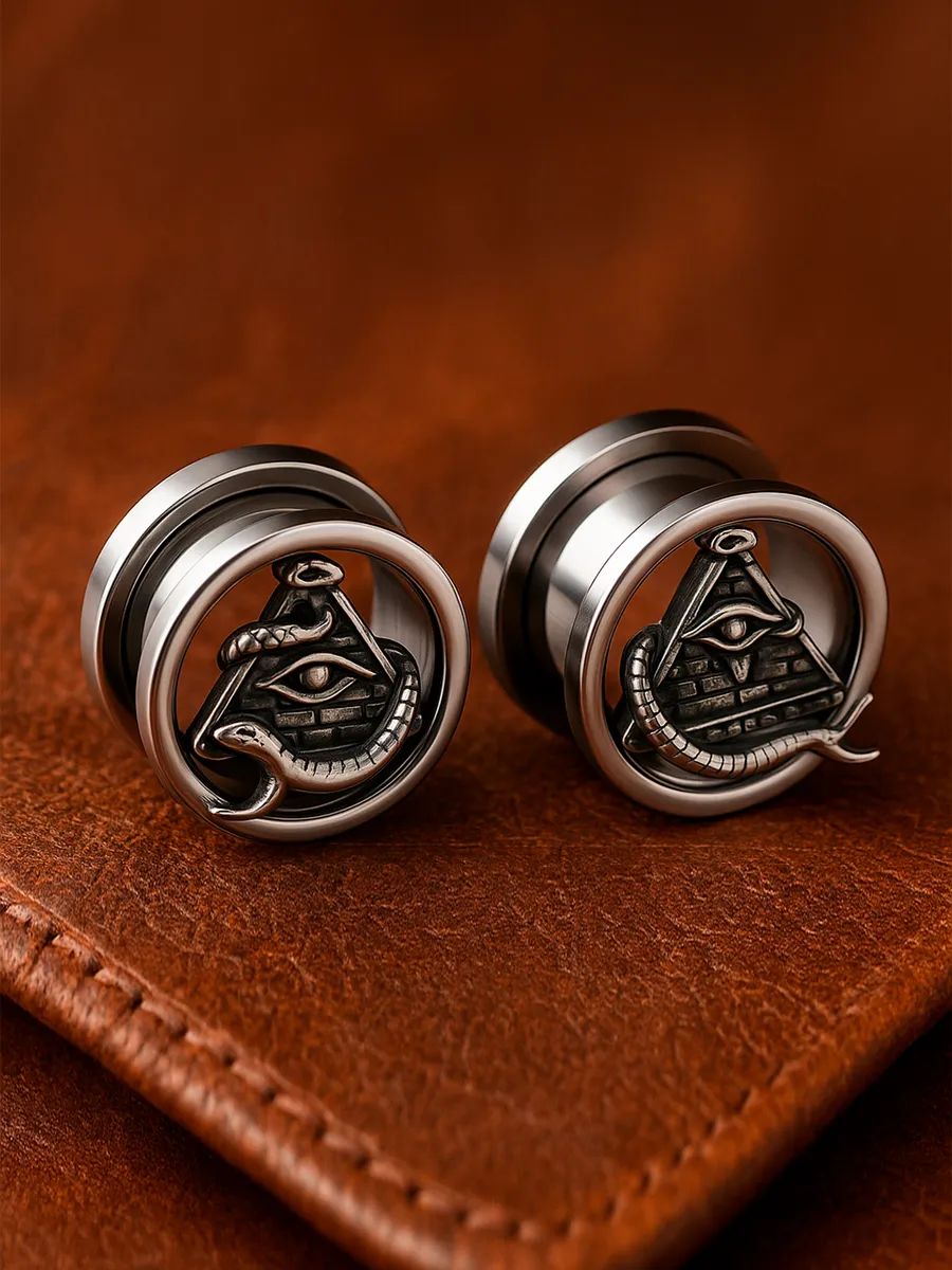 Мужские и женские тоннели из хирургической стали с уникальным дизайном: всевидящее око на пирамиде, обвитое змеёй. Аксессуар подчёркивает стиль и индивидуальность, подходит для неформального образа, рок- и альтернативной моды.