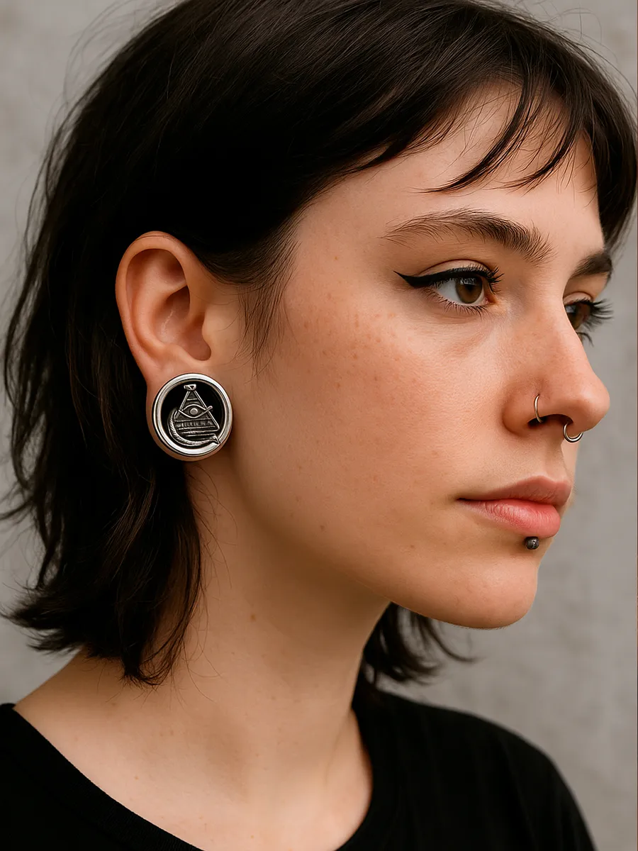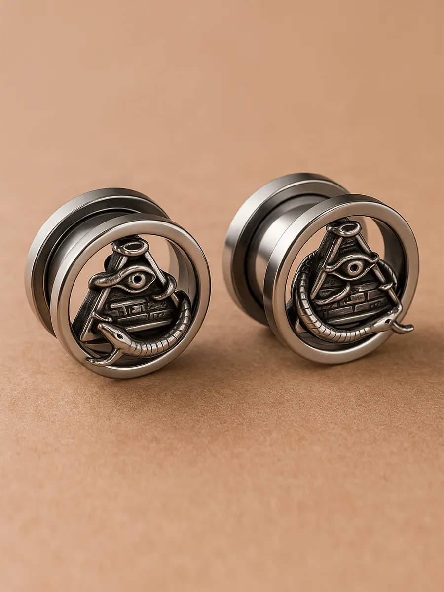 Мужские и женские тоннели из хирургической стали с уникальным дизайном: всевидящее око на пирамиде, обвитое змеёй. Аксессуар подчёркивает стиль и индивидуальность, подходит для неформального образа, рок- и альтернативной моды.
