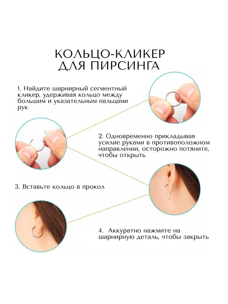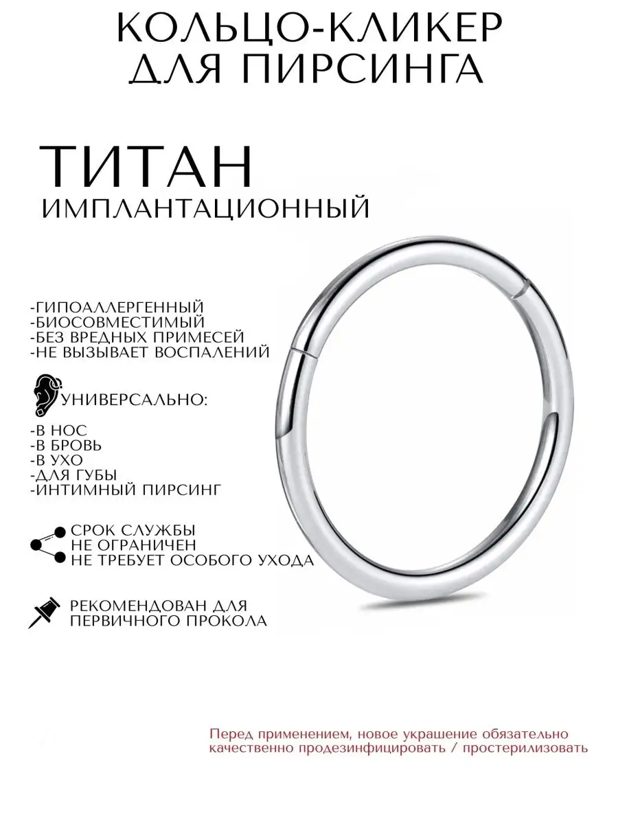 Пирсинг кликер кольцо ( Внутренний диаметр: 6, 8, 10, 12 мм) , ( Толщина 1,2 мм). Материал ТИТАН ASTM F136. ( Стандартная спецификация для кованого сплава Ti-6Al-4V ELI для хирургических имплантатов). Кольцо-кликер для разных видов пирсинга: септум, колечко для крыла носа, моносерьга в мочку ушей, круглая одиночная сережка в хрящ уха, хеликс, трагус, для козелка, брови, губу, пупок, интимный пирсинг сосков груди. Перед применением, новое украшение обязательно качественно простерилизовать.