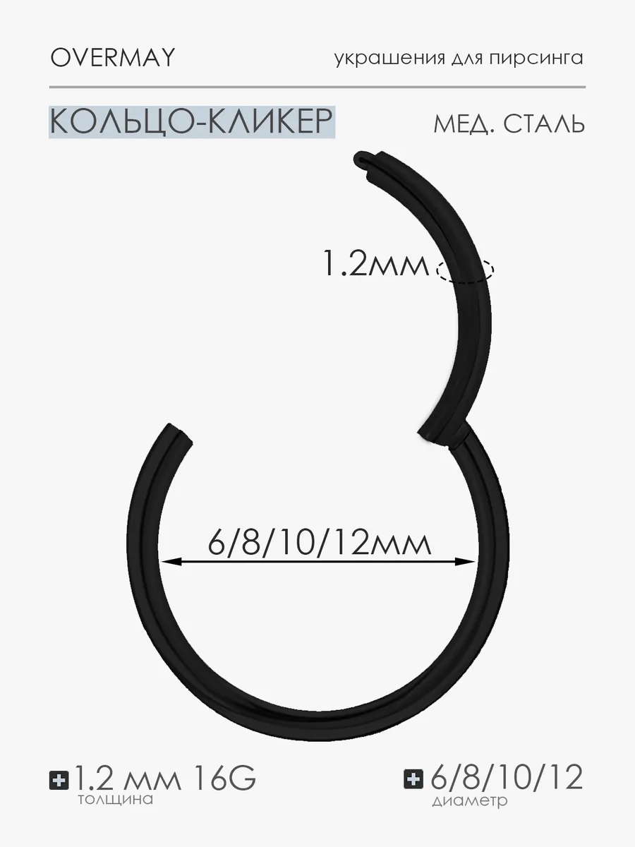 Кольцо кликер толщиной 1,2 мм (16G) . Диаметром: 6 мм, 8 мм, 10 мм, 12 мм. Предназначено для пирсинга септума носа, мочки или хряща уха, губ, брови.