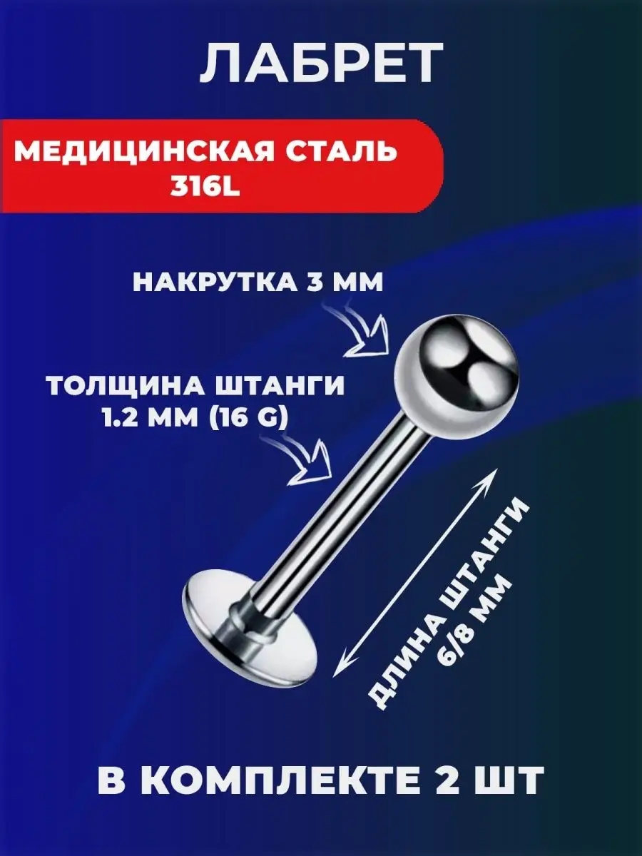 Серьга-лабрет требует прокола и служит для пирсинга "Монро","Медуза","Мадонна","Укус акулы","Укус змеи","Укус георгина", а так же других видов пирсинга.Лабрет для пирсинга, серьга лабрет. Комплектация - 2 серьги.