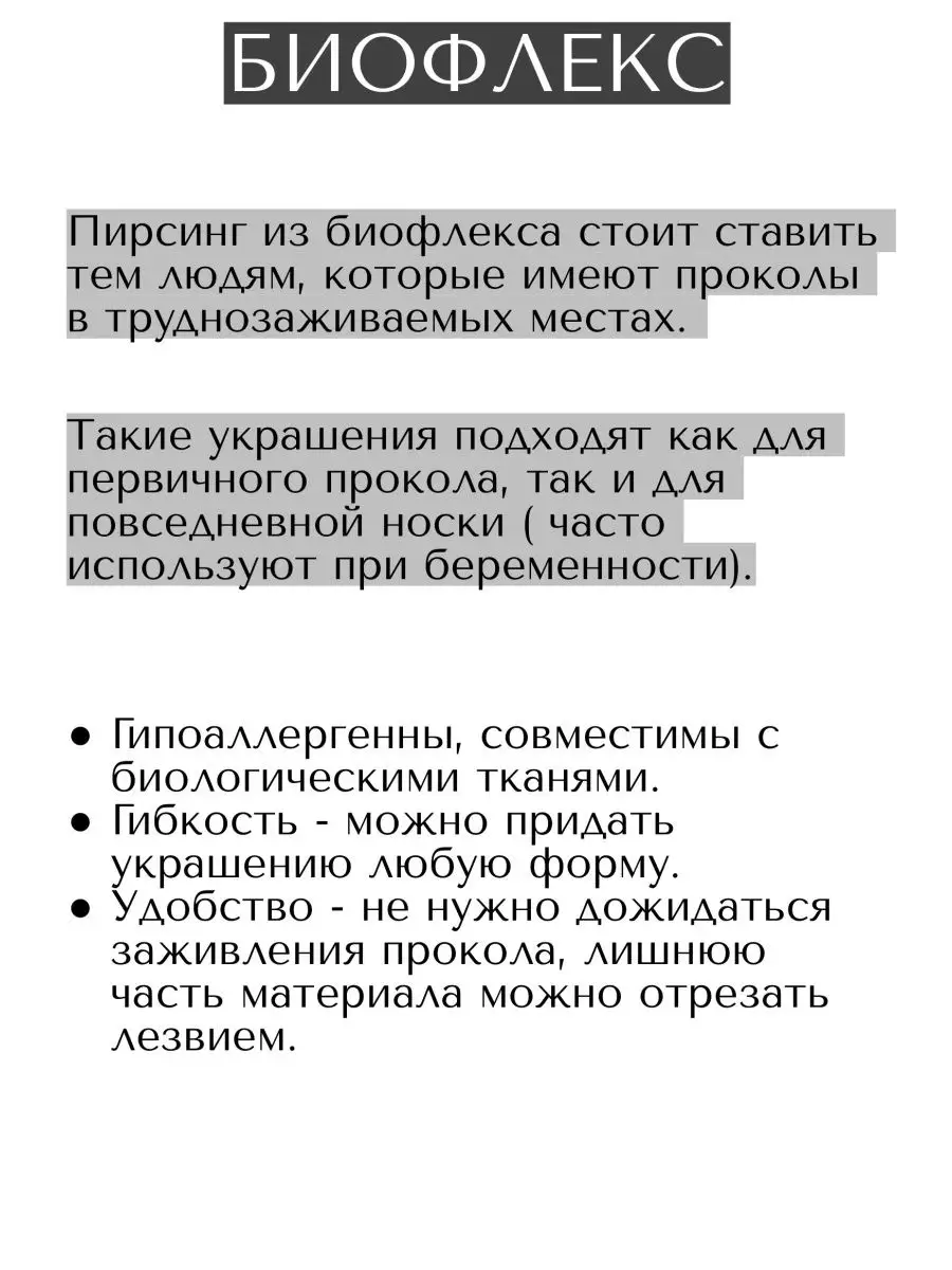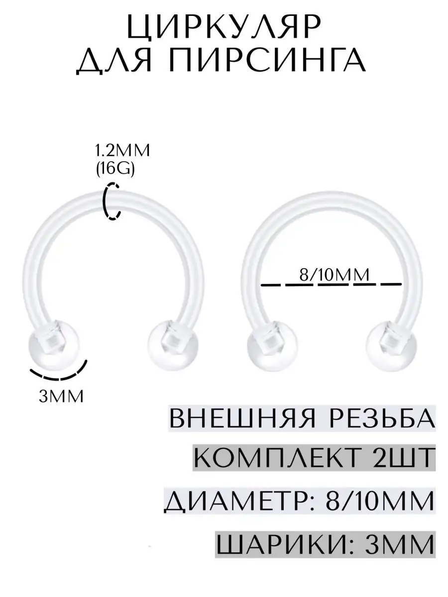 Внутренний диаметр: 10мм. Толщина: 1.2мм. Шарики: 3мм. Подходит тем , у кого аллергическая реакция и неприятие к металлам. Так же, используется при беременности. Не окисляются в проколе и по весу намного легче стальных аналогов. Украшение имеет внешнюю резьбу и не повреждает стенки прокола при продевании. Подходят как для первичных проколов, так и для зажившего пирсинга, можно носить каждый день. Универсальный, подходит для пирсинга в септум, ушей, брови, пупка, пирсинга губы и таких проколов, как: хеликс (пирсинг хряща ушка) или трагус (пирсинг козелька) а также интимного пирсинга. Внимательно подходите к выбору размеров циркуляра для пирсинга. В комплекте 2штуки.Циркуляр биофлекс, циркуляр акриловый, циркуляр биопласт.