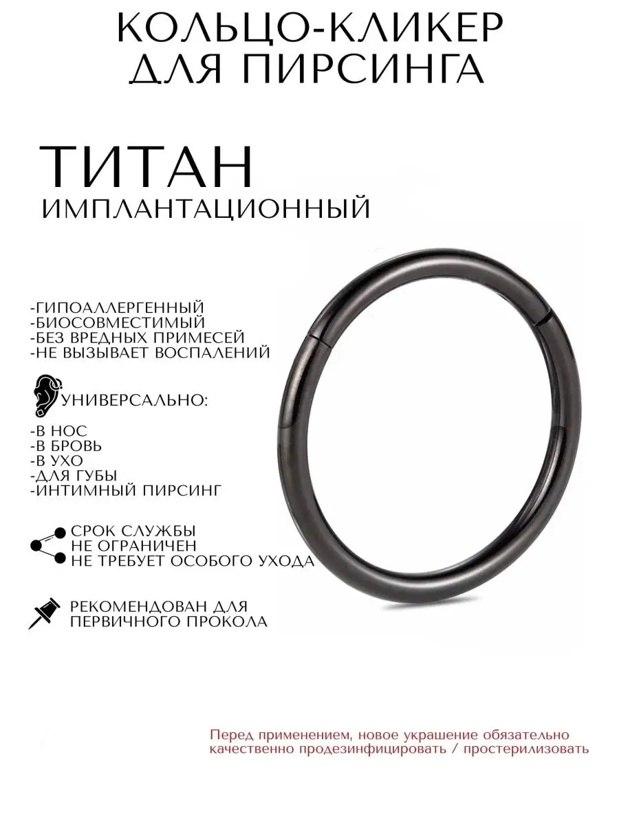 Пирсинг кликер кольцо ( Внутренний диаметр: 6, 8, 10, 12 мм) , ( Толщина 1,2 мм). Материал ТИТАН ASTM F136. ( Стандартная спецификация для кованого сплава Ti-6Al-4V ELI для хирургических имплантатов). Кольцо-кликер для разных видов пирсинга: септум, колечко для крыла носа, моносерьга в мочку ушей, круглая одиночная сережка в хрящ уха, хеликс, трагус, для козелка, брови, губу, пупок, интимный пирсинг сосков груди. Перед применением, новое украшение обязательно качественно простерилизовать.